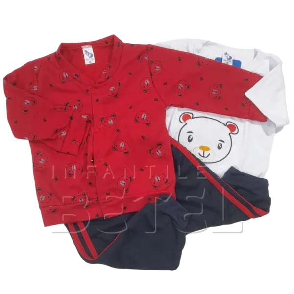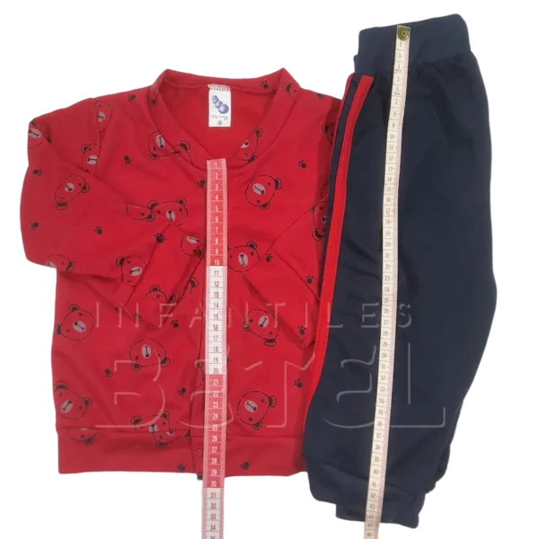 Chaqueta roja abierta con camiseta y pantalón con rayas rojas,
